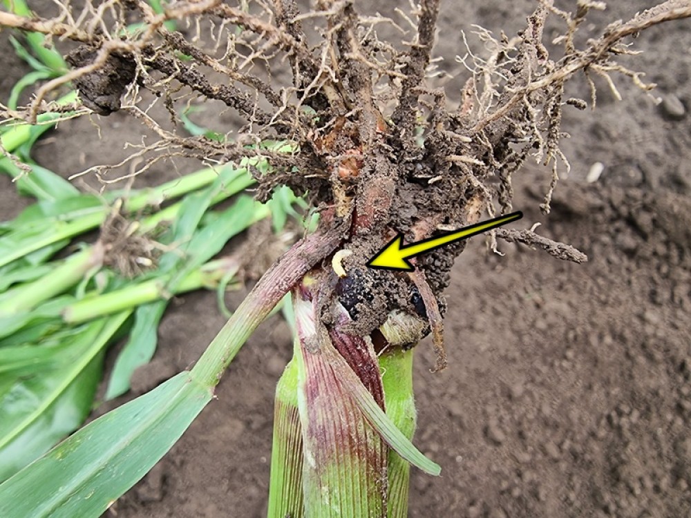Przy uprawie kukurydzy w monokulturze istnieje możliwość zastosowania zapraw nasiennych opartych o teflutrynę bądź cyjanotraniliprol posiadających rejestrację na larwy tego szkodnika. Można także zastosować aplikację mikrogranulatów doglebowych w trakcie siewu kukurydzy opartych na teflutrynie bądź cypermetrynie. Zwalczanie larw jest jednym z najprostszych sposobów zwalczania szkodnika na monokulturach. W gospodarstwach ukierunkowanych na ekologię, do zwalczania larw można użyć biopreparat na bazie nicienia owadobójczego Heterorhabditis bacteriophora, który aplikuje się dozownikiem do nawozów płynnych w trakcie siewu kukurydzy.