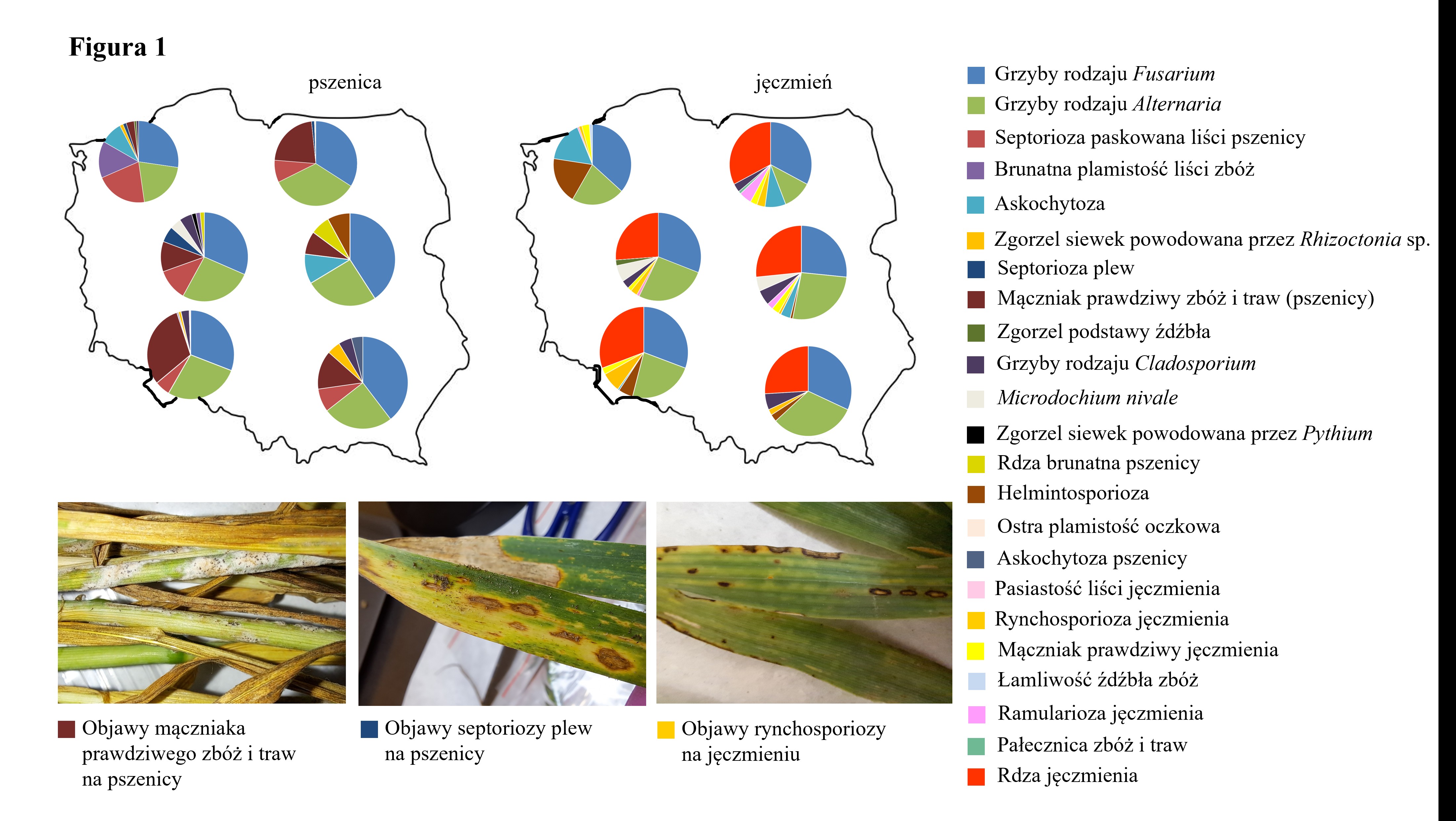 W populacji obydwu badanych zbóż przeważały choroby powodowane przez grzyby. Najczęściej obserwowane na pszenicy i jęczmieniu objawy chorobowe były spowodowane porażeniem przez grzyby rodzaju Fusarium oraz Alternaria. Na pszenicy w każdej lokalizacji występował mączniak prawdziwy zbóż i traw (sprawca Blumeria graminis f. sp. tritici) oraz septorioza paskowana liści pszenicy (sprawca Septoria tritici). Występowanie brunatnej plamistości liści zbóż (powodowanej przez Drechslera tritici-repentis) na pszenicy ograniczało się tylko do Polski Zachodniej (woj. zachodniopomorskie, wielkopolskie i dolnośląskie). Istotną dla tego gatunku chorobą była również askochytoza (wywoływana przez Ascochyta graminicola i A. tritici) występująca w woj. zachodniopomorskim, warmińsko-mazurskim i mazowieckim. Najmniejszy udział procentowy w populacji grzybów w pszenicy mieli sprawcy septoriozy plew pszenicy (Septoria nodorum), rizoktoniozy (Rhizoctonia solani), pleśni śniegowej (Microdochium nivale), helmitosporiozy (Bipolaris sorokiniana), ostrej plamistości oczkowej (Ceratobasidium cereale), mączniaka prawdziwego jęczmienia (Blumeria graminis f. sp. hordei), zgorzeli podstawy źdźbła (Gaeumannomyces graminis), rdzy brunatnej pszenicy (Puccinia recondita f. sp. tritici) oraz grzyby rodzaju Cladosporium i Pythium. W przypadku jęczmienia, oprócz ww. grzybów z rodzaju Fusarium i Alternaria, dominującym patogenem był sprawca rdzy jęczmienia (Puccinia hordei), który występował w każdej lokalizacji prócz woj. zachodniopomorskiego. Ponadto, tak jak dla pszenicy, istotną dla jęczmienia chorobą była askochytoza. Najmniejszy udział procentowy w populacji grzybów w jęczmieniu mieli sprawcy pasiastości liści jęczmienia (Drechslera teres), rynchosporiozy jęczmienia (Rhynchosporium secalis), ramulariozy jęczmienia (Ramularia collo-cygni), łamliwości źdźbła zbóż (Oculimacula sp.), zgorzeli podstawy źdźbła, pałecznicy zbóż i traw (Typhula sp.), a także Microdochium nivale oraz grzyby rodzaju Cladosporium.