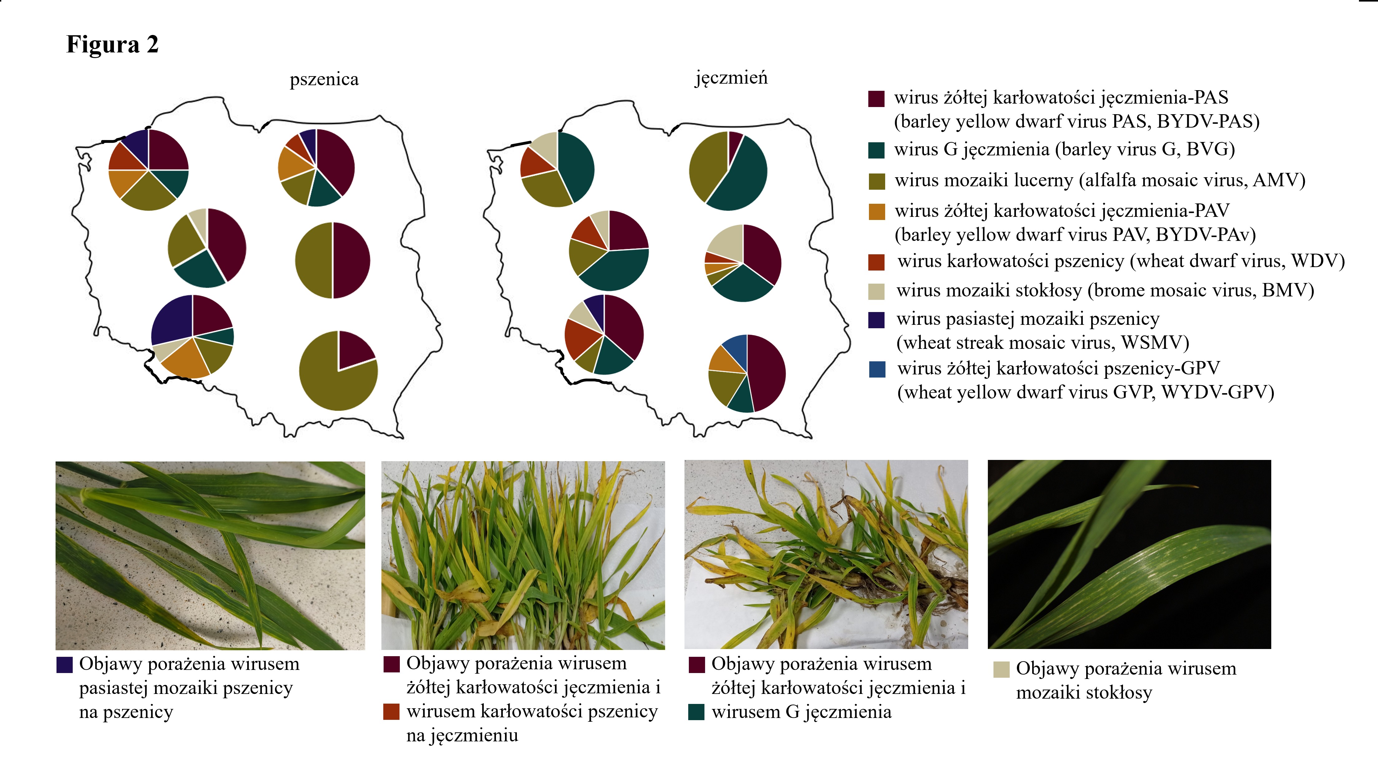 Na terenie Polski oba gatunki zbóż porażone były wirusami żółtej karłowatości jęczmienia PAS i PAV (barley yellow dwarf virus - PAS, -PAV; BYDV-PAS i -PAV), przy czym gatunkiem dominującym był BYDV-PAS. W większości lokalizacji obserwowano również porażenia obydwu badanych zbóż wirusem mozaiki stokłosy (brome mosaic virus, BMV) oraz pojedyncze przypadki porażeń wirusem karłowatości pszenicy (wheat dwarf virus, WDV). Kolejnym wykrywanym patogenem był wirus G jęczmienia (barley G virus, BVG), który występował znacznie częściej na jęczmieniu, jego dominującym gospodarzu. Co więcej, wszystkie rośliny jęczmienia porażone były przez hordeum vulgare alphaendorna virus (HvEV). Jest to symbiotyczny gatunek wirusa, który samodzielnie nie powoduje objawów chorobowych. Jednakże, jak dotychczas nie ustalono jego wpływu na przebieg patogenezy infekcji mieszanych kilku gatunków wirusów. Ponadto, na terenie trzech województw (zachodniopomorskiego, warmińsko-mazurskiego i dolnośląskiego) potwierdzono obecność wirusa pasiastej mozaiki pszenicy (whaet streak mosaic virus, WSMV). Najsilniejsze porażenie stwierdzono w województwie dolnośląskim gdzie wirusa zidentyfikowano zarówno w roślinach pszenicy jak i jęczmienia. Wyniki badań prowadzonych w Zakładzie Wirusologii i Bakteriologii IOR-PIB wskazują, że WSMV występował w tej lokalizacji już kilka lat temu, stąd wniosek, że stanowi on stałe zagrożenie dla upraw zbóż w tym regionie. Z kolei nowym zagrożeniem dla upraw zbóż w naszym kraju może być wykryty po raz pierwszy w Polsce wirus żółtej karłowatości pszenicy GPV (wheat yellow dwarf virus, WYDV-GPV), którego obecność potwierdzono na jęczmieniu, na terenie województwa podkarpackiego. Wirus ten przenoszony jest przez różne gatunki mszyc i prawdopodobnie napłynął do Polski z krajów sąsiadujących, w których jest rozpowszechniony tj. Ukraina, Słowacja, Czechy czy Niemcy. Ponadto, warto też zwrócić uwagę na wykrycie porażeń pszenicy i jęczmienia przez wirusa mozaiki lucerny (alfalfa mosaic virus, AMV). Gatunek ten był już stwierdzany na terenie naszego kraju, ale jeszcze nigdy dotąd na zbożach. Jest to zatem także przykład wykrycia nowego zagrożenia upraw zbóż.